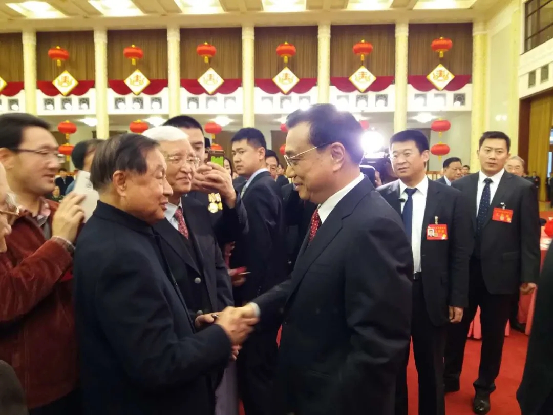 2016年春節(jié)團(tuán)拜會上,李克強(qiáng)總理與高尚全握手
