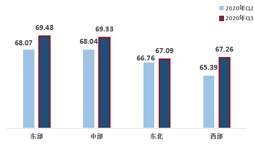 2、從區(qū)域來(lái)看,改革熱度指數(shù)值呈地域特征,東部地區(qū)略高于中部地區(qū)位列第一;但西部地區(qū)升幅明顯,東北地區(qū)以微弱差距低于西部地區(qū)。第三季度,東部、中部、東北、西部的改革熱度指數(shù)分別為69.48,69.33,67.09,67.26,比上一季度均有上升。其中,西部地區(qū)的升幅較大,東北地區(qū)升幅較小。