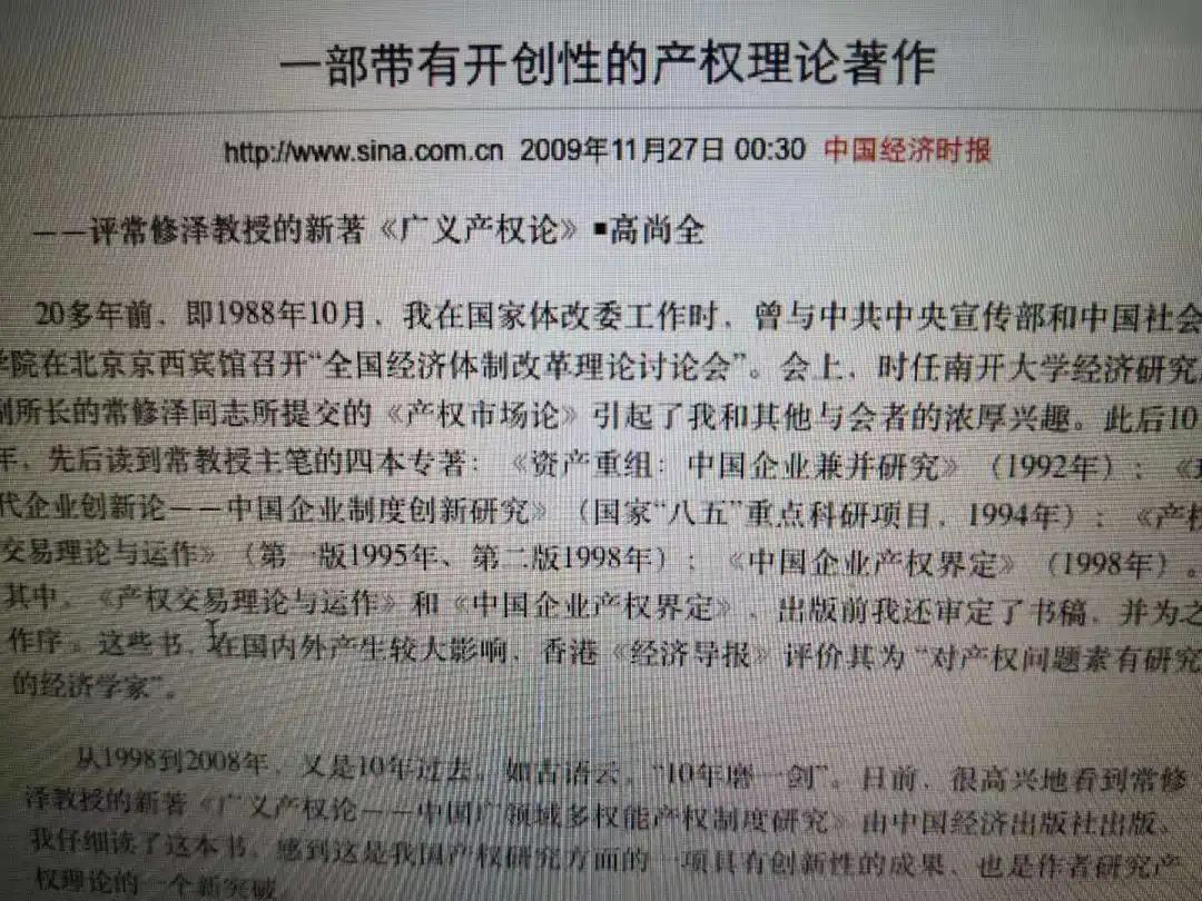 出版后,有肯定,也有非議:如說天地人產(chǎn)權(quán)是“異想天開”,產(chǎn)權(quán)三要義(廣領(lǐng)域、多權(quán)能、四聯(lián)動(dòng))“過于寬泛”等等(這很正常的)。在此之際,您也參與討論,公開發(fā)表文章,支持“從世界和中國(guó)大局研究產(chǎn)權(quán)問題”;肯定“廣義產(chǎn)權(quán)理論”,認(rèn)為“對(duì)國(guó)家發(fā)展有應(yīng)用價(jià)值”等(見高尚全:《一部帶有開創(chuàng)性的產(chǎn)權(quán)理論著作》,《中國(guó)經(jīng)濟(jì)時(shí)報(bào)》2010年11月27日)。今天,再憶這段往事,再讀您的文章,既感謝您2003年的指點(diǎn),也感激您2010年的支持。