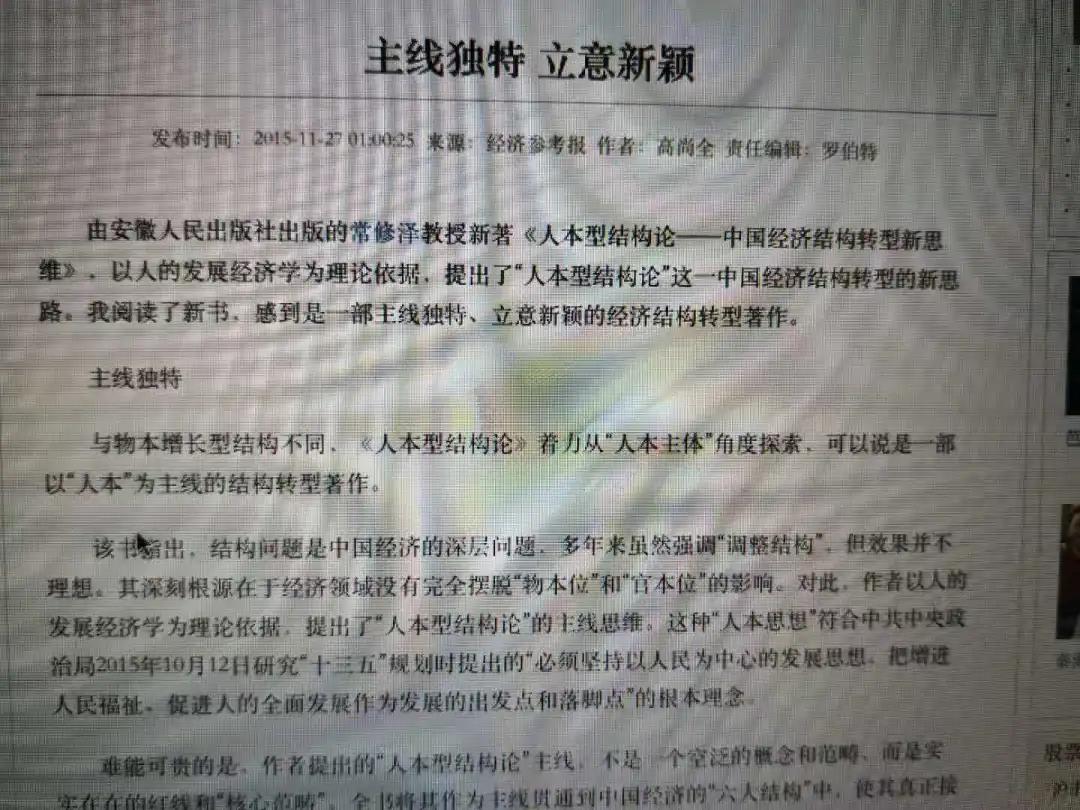 七年后,2008年,人本經(jīng)濟(jì)學(xué)研究成果專著之一《人本體制論——中國(guó)人的發(fā)展及體制安排研究》出版。又過七年,2015年,人本經(jīng)濟(jì)學(xué)研究成果專著之二《人本型結(jié)構(gòu)論——中國(guó)經(jīng)濟(jì)結(jié)構(gòu)轉(zhuǎn)型新思維》也出版問世。在書中,按照我的人本經(jīng)濟(jì)學(xué)理念,特別挖掘了馬克思在《政治經(jīng)濟(jì)學(xué)批判導(dǎo)言》中關(guān)于“人”是主人、“品”是“仆役”的思想,試圖與傳統(tǒng)的“物本經(jīng)濟(jì)學(xué)”和“權(quán)本經(jīng)濟(jì)學(xué)”“ 劃清界限。我沒有忘記:出版后,您在《經(jīng)濟(jì)參考報(bào)》撰文給予支持,題目雖然只有八個(gè)字:“主線獨(dú)特.立意新穎”,但觀點(diǎn)鮮明,呵護(hù)有加,頗感溫暖(見高尚全:《主線獨(dú)特.立意新穎》,《經(jīng)濟(jì)參考報(bào)》2015年12月1日)。
