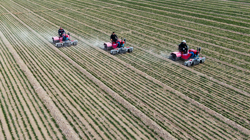 2月17日,在山東省聊城市莘縣妹冢鎮(zhèn),農(nóng)民在麥田里進(jìn)行鎮(zhèn)壓保墑作業(yè)(無(wú)人機(jī)照片)。新華社記者 郭緒雷 攝