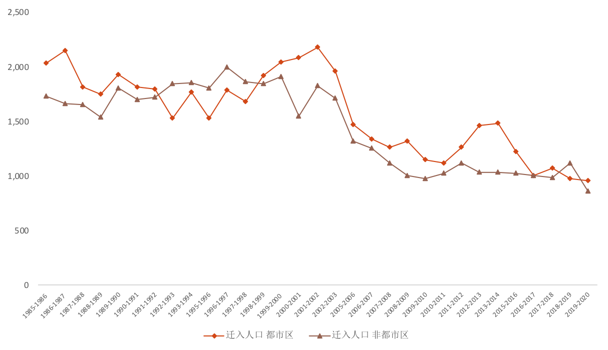 圖3:美國城鄉(xiāng)融合的表現(xiàn)-非都市區(qū)的人口遷入量與都市區(qū)人口遷入量趨同
