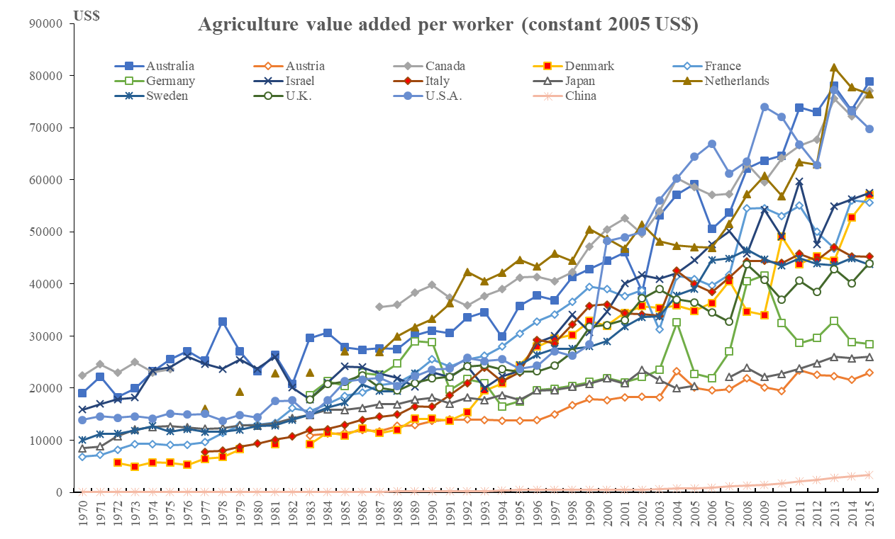 如圖5,西方城市化過程中兩個(gè)收入差距的縮小在中國沒有出現(xiàn)。中國在最快速城市化階段出現(xiàn)了城鄉(xiāng)收入差距拉大,第一是我們只有快速城市化,但沒有城鄉(xiāng)融合。第二是我們城市化的模式是回村的城市化模式。在城市里干工作,干到一定程度再回到農(nóng)村,這是全世界沒有的。第三是農(nóng)業(yè)競爭力下降?,F(xiàn)在一定要有一個(gè)認(rèn)識(shí),農(nóng)業(yè)的份額降到10%以后,各個(gè)國家的農(nóng)業(yè)到底在干什么?我們現(xiàn)在想到農(nóng)業(yè)到10%,再到2%、1%,農(nóng)業(yè)就可有可無了,這種觀點(diǎn)是錯(cuò)誤的。所有國家的農(nóng)業(yè)在降到10%以后,農(nóng)業(yè)在變強(qiáng),它的農(nóng)業(yè)和原來的農(nóng)業(yè)完全不一樣。中國由于單向城市化的模式,最后農(nóng)業(yè)競爭力進(jìn)一步下降。(如圖6)我們現(xiàn)在只有6%、7%的農(nóng)業(yè),這個(gè)農(nóng)業(yè)的競爭力是下降的,背后是農(nóng)業(yè)成本上升,所有成本都在上升。