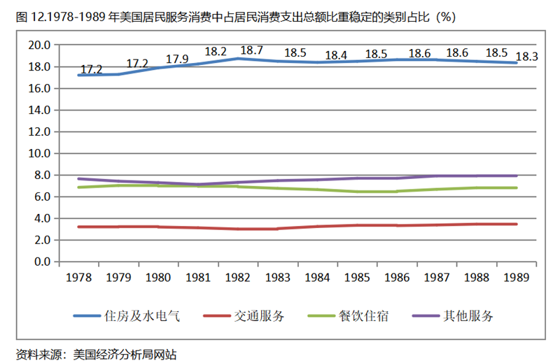美國在人均GDP超過1萬美元后的1978-1989年期間,居民服務(wù)消費占居民消費支出總額持續(xù)提高,而居民耐用品消費占居民消費支出總額比重、非耐用品消費占居民消費支出總額比重均呈現(xiàn)下降趨勢。